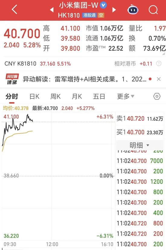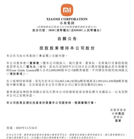 前一日晚间,小米集团发布公告称,公司首创东说念主、董事长兼CEO雷军通过其全资领有的Team Guide Limited,于当日在公开阛阓增抓260万股公司B类庸俗股,增抓均价约为每股38.58港元,计较耗资超1亿港元,其计较抓有40.63亿股A类庸俗股及19.94亿股B类庸俗股,占公司已刊行股份总和的比例约为23.26%。